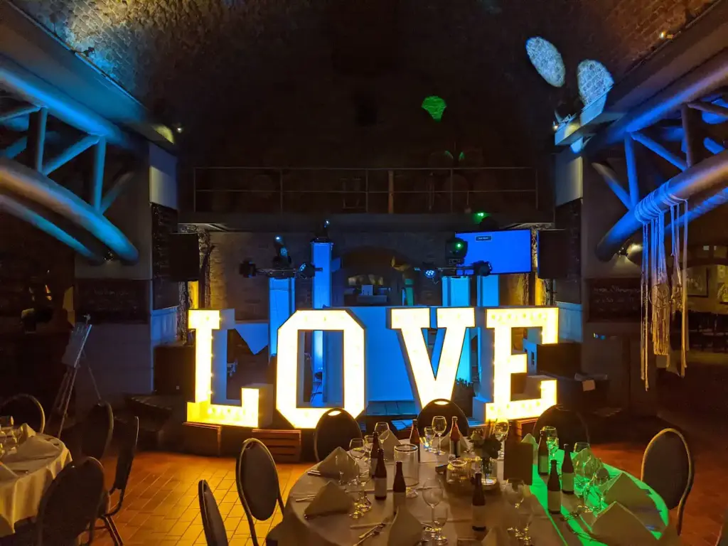 Eine Location wie Barres Brauwelt lebt von ihrer Atmosphäre. Durch unsere großflächige LED-Ambientebeleuchtung haben wir die historischen Mauern in ein warmes, festliches Licht getaucht. Ein absoluter Eyecatcher und das perfekte Fotomotiv waren unsere 1,20m hohen XXL-LOVE-Leuchtbuchstaben, die im Saal für ein exklusives Flair sorgten. Als Hochzeits-DJ für Lübbecke, Gehlenbeck und Nettelstedt weiß ich, dass das Auge mitfeiert – ein stimmiges Lichtkonzept macht hier den entscheidenden Unterschied.