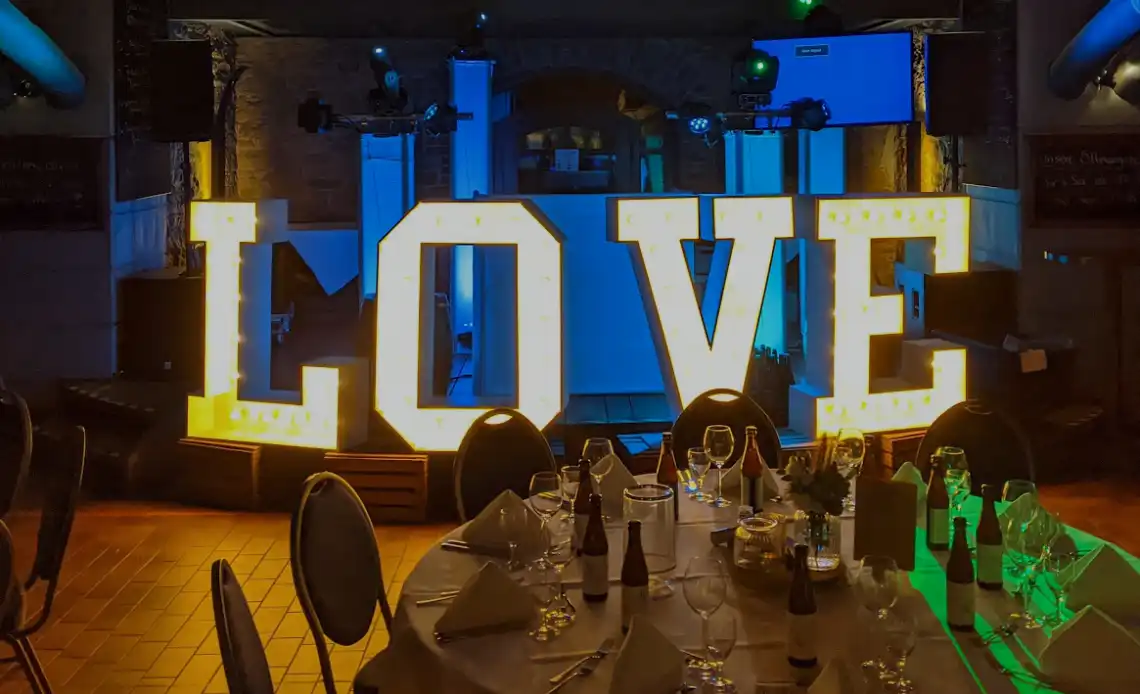 Romantik im Hof Von Laer! Erfahren Sie, wie unsere XXL Love-Buchstaben in Herford den Festsaal in ein strahlendes Lichtermeer verwandelt haben. Das perfekte Highlight für Hochzeitsfotos und festliches Ambiente.